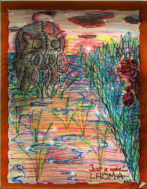 The pair walked, neared the beach, trod its small grassy dunes, and made their way to the shore. Naradan looked at her right foot and then her left, and her boots were gone. Zere turned back and with a girlish smile, winked at Dina and ran into the sea's brilliant webwork of bubbles drawn back out to the next wave's crash. Far enough out to be sprayed, she laughed sharply at the cold, and then with happy eyes, pled Dina join her. Momentarily delayed by the doff of her shoes, Dina likewise exclaimed as the cold wash rushed over her feet, up her shins, and splashed her upturned cuffs. Just in time to be spattered with finger-flicked brine, Dina laughed and doused Zereshem in rapid waves until she endured the same from the other. The sunset was beautiful: one of clarity of blue embraced by an electric rust. When Dina thought that all had been seen, Naradan stayed her departure and pointed at the horizon,